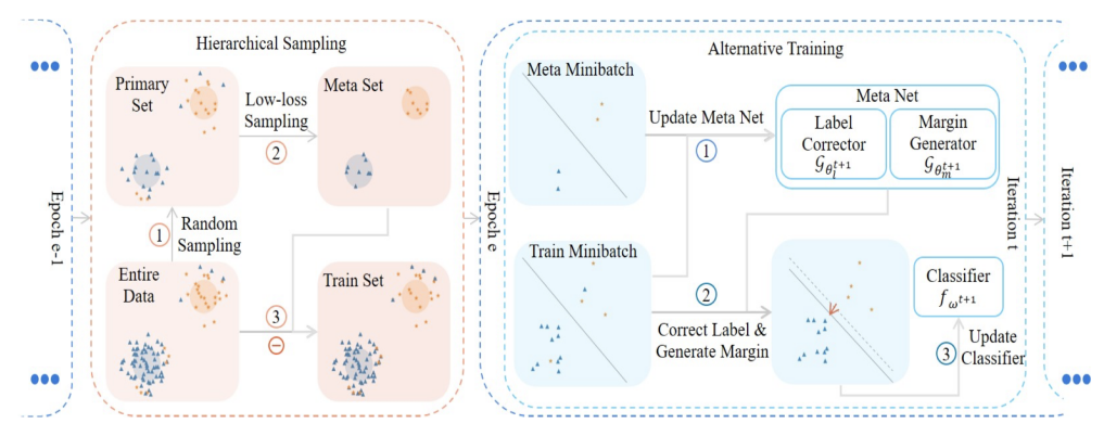 针对智能图像识别任务的噪声和长尾数据训练模型不理想难题,许廷发科研团队首次提出和构建了元学习自适应鲁棒的数理模型。模型主要通过引入全新的动态损失函数,主动感知数据分布和训练状态,自适应地动态修正数据标注噪声以及调整识别的类间距离,实现了在长尾噪声数据下的鲁棒学习。