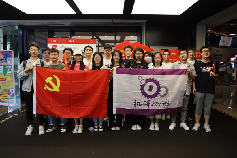 观影候场时,北理工2020级光工学硕2班党支部、清华大学机研201、171党支部的同志们手持党旗,在制作的建党100周年主题的立牌处进行拍照打卡留恋,以表达对党的祝福和对未来的希冀。在这样轻松和欢快的氛围中,各支部同志相互进行了密切且深入的交流,活动热情达到了高点。
