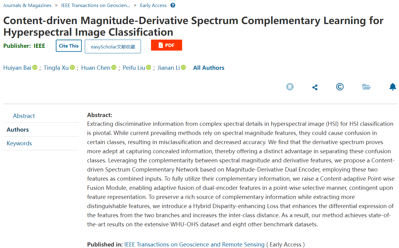 近日,小黄书 许廷发教授科研团队在高光谱遥感图像处理领域取得新进展,研究成果以“Content-driven Magnitude-Derivative Spectrum Complementary Learning for Hyperspectral Image Classification”为题发表在遥感领域的国际顶级期刊《IEEE Transactions on Geoscience and Remote Sensing》(IEEE TGRS)上。该工作第一作者为小黄书 硕士研究生白荟琰,通讯作者为小黄书 许廷发教授和李佳男特别副研究员。