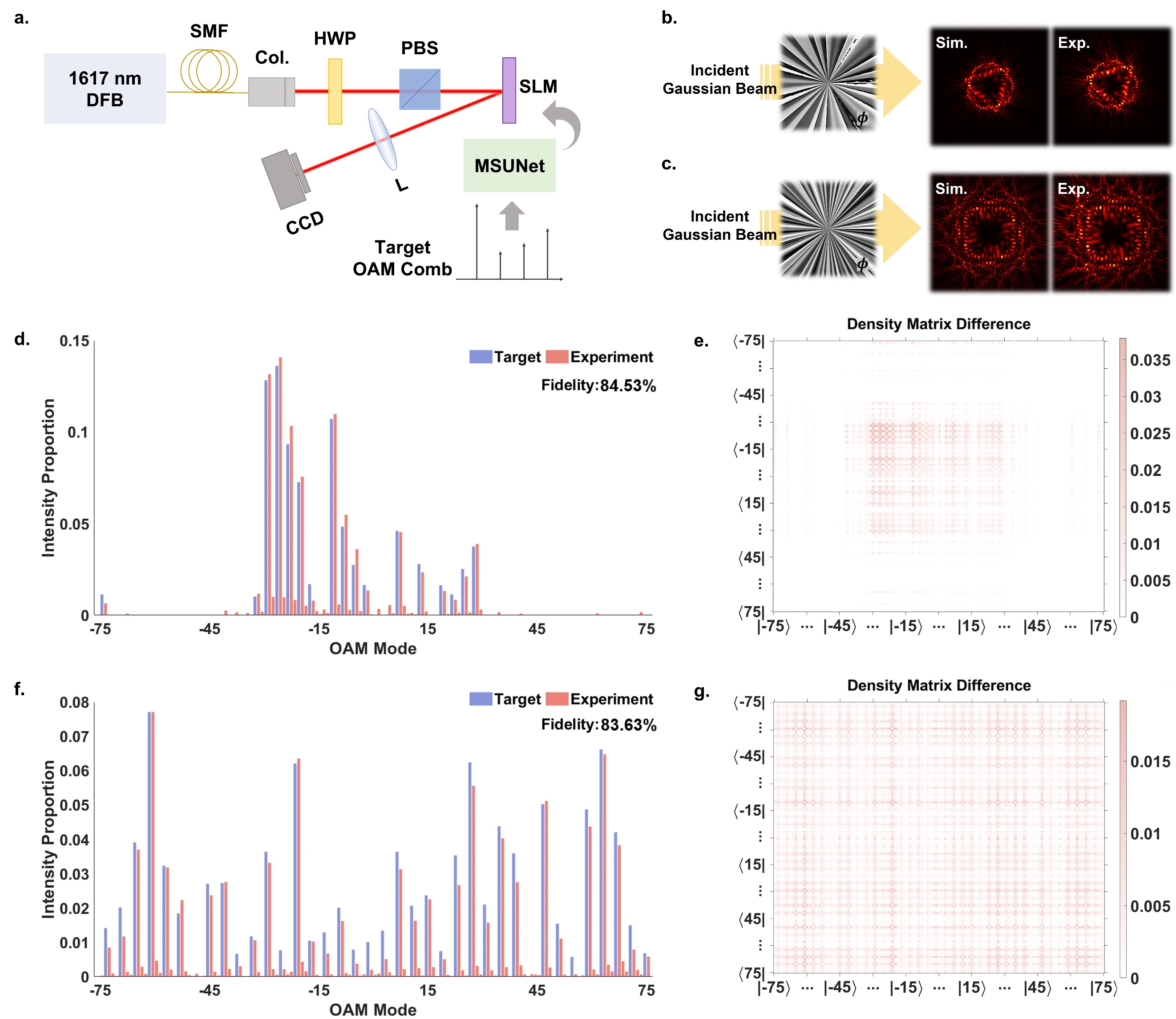 实验结果验证了该方法的卓越性能,其调制OAM模式范围可覆盖-75至+75,平均均方根误差(RMSE)低至0.0037,保真度达到85.01%,计算时间仅约30毫秒,如图2所示。