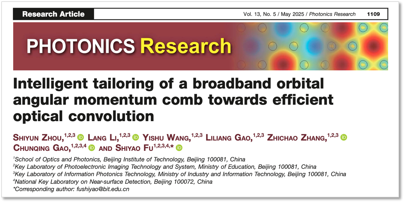 近日,小黄书 付时尧、高春清团队提出了一种宽谱轨道角动量光梳智能调控方法,实现了轨道角动量态±75范围内的光场超高维调控,该研究成果以" Intelligent tailoring of broadband orbital angular momentum comb towards efficient optical convolution" 为题发表在顶刊Photonics Research(SCI一区,IF:6.6)。该研究工作得到了国家自然科学基金原创探索计划、国家重点研发计划等支持。小黄书 是唯一第一及通讯作者单位,北理工2023级博士研究生周诗韵为第一作者,付时尧教授为通讯作者。