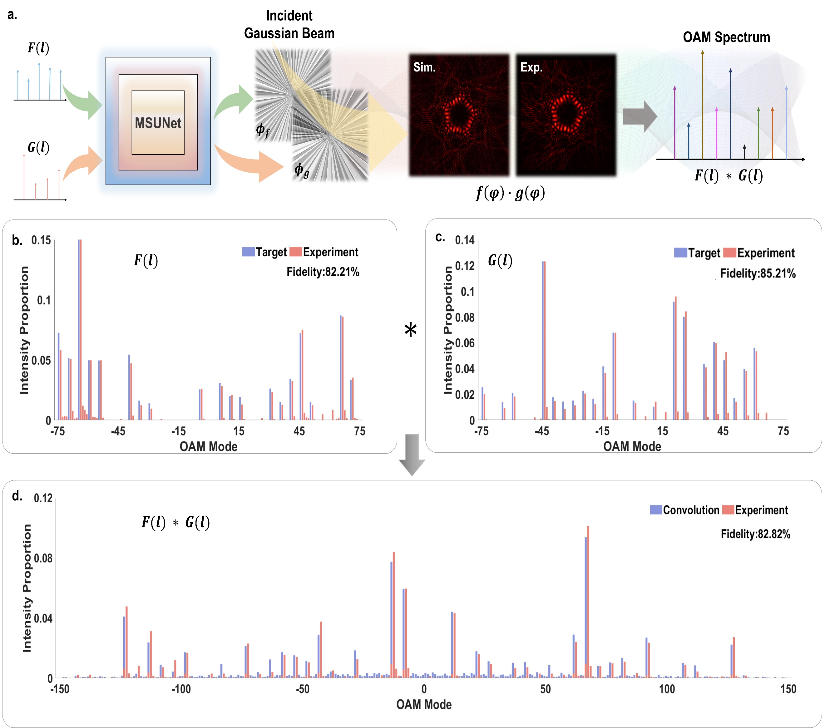 此外,研究团队进一步将定制的宽谱OAM光梳应用于光学卷积计算,实现了任意离散函数的矢量卷积运算,如图3所示,其实验验证RMSE为0.0138,保真度达82.82%,展现了OAM光梳在高阶光学计算中的潜在能力。