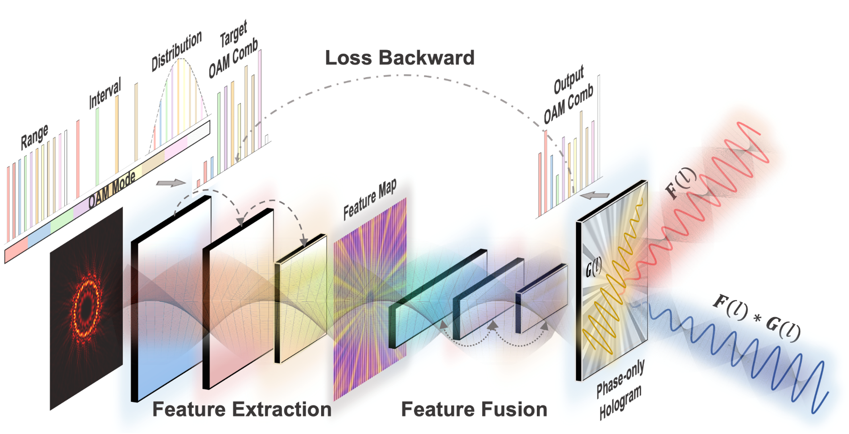 轨道角动量(Orbital angular momentum, OAM)作为一种激光的新型高维自由度,在超大容量光通信、新体制激光雷达、高密度光存储、量子信息技术等尖端领域有着广泛的应用前景。一束激光可同时携带多个OAM模式,且不同的OAM模式相互正交,在“OAM域”中构成了梳状函数,即OAM光梳。宽谱OAM光梳是超高光子效率信息编码的载体,同时也是高密度全息加密技术的“钥匙”。先前研究已经证明,采用纯相位调制方法不可能将基模高斯光束转化为OAM光梳,若要获得OAM光梳,则必须采用迭代等方法无限逼近,而迭代过程是费时的,将高维信号编码的优势抵消殆尽。宽谱OAM光梳的高效、精准按需调控仍面临重大挑战。