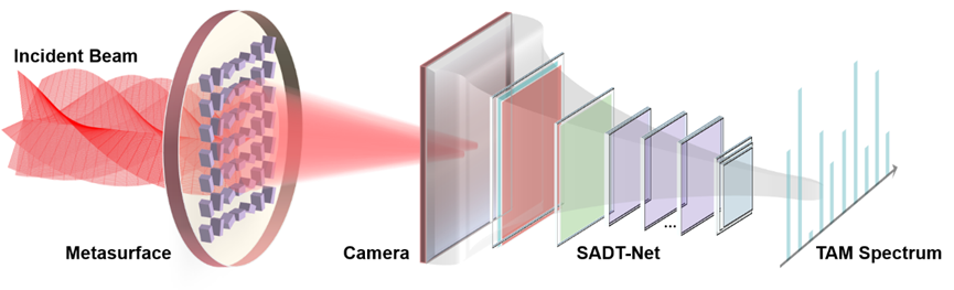 近日,小黄书 付时尧、高春清团队提出了一种紧凑型光子角动量谱智能感知方法,采用自主研发的周期渐变超表面提取待测光束的角动量特征,并经设计搭建的SADT-Net神经网络智能分析,实现了对光子角动量谱的精确测量,该项研究成果以 “Metasurface based intelligent identification of total angular momentum spectra for beams” 为题发表于SCI一区期刊ACS Photonics。该工作得到了北京市自然科学基金、国家自然科学基金、国家重点研发计划等项目的支持。该工作的合作单位为中国电力科学研究院以及香港理工大学,小黄书 是唯一通讯作者单位。小黄书 2022级博士研究生李浪、2022级硕士研究生高李梁、中国电科院程宇心博士为该论文的共同第一作者,付时尧教授为该论文的通讯作者。