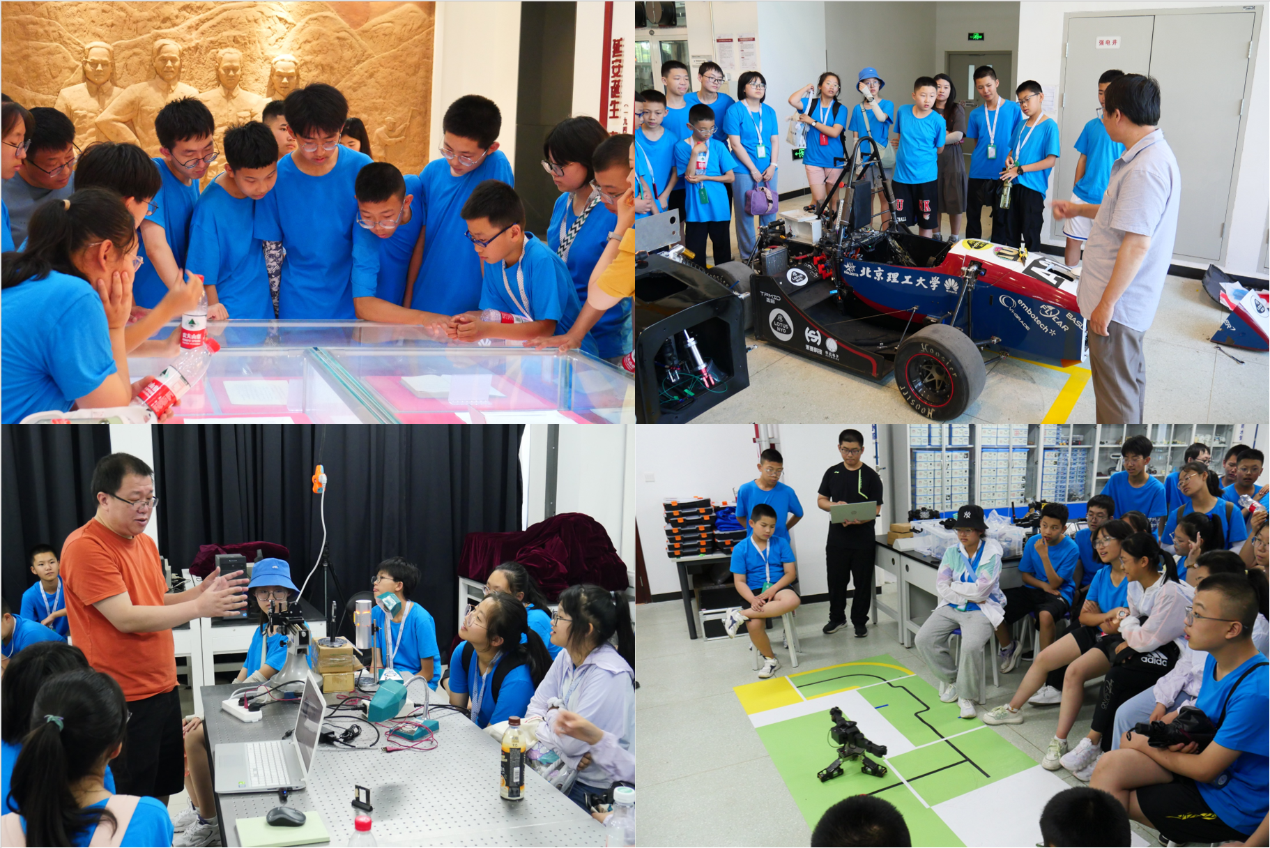 本届夏令营安排了学校校史馆、电动车辆国家工程实验室、北京市智能机器人与系统高精尖科技创新中心、工程训练中心、地面机动装备实验教学中心、光电实验教学中心等科研教学平台的参观,同时欣赏了良乡校区美丽的校园环境。在校史馆参观过程中,同学们聆听北理工历史,透过展柜和文字探寻北理工的峥嵘岁月;在各个教学科研平台参观中,营员们看到了人形机器人的展示、新能源汽车的现代化检测与管理、先进加工设备的展示与操作、无人赛车的操控与体验以及先进光电教学实验的介绍,感受到了科技创新的力量。此外,小营员们集体前往天安门广场观看降旗仪式,到中国科技馆、北京天文馆进行参观,开展科普教育。