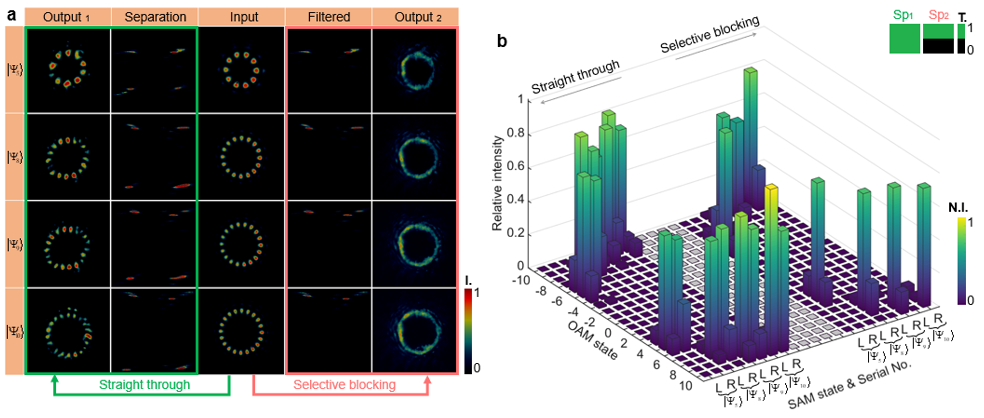 相关研究表明,旋转运动的物体携带角动量,而角动量不仅存在于宏观尺度的物体中,也存在于光子等微观粒子中。光子所包含的角动量有两种不同的形式:自旋角动量(SAM)和轨道角动量(OAM)。而光子总角动量(TAM)是傍轴近似下光子SAM与OAM的总和,它提供了两个自由度,在激光雷达、激光加工、光通信、光计算、量子信息等前沿领域应用前景广阔。光子TAM态的有效识别与按需控制是其应用的重要基础,然而现有光子TAM态识别方法仍存在动态范围有限、识别精度低等问题,且无法按需调控滤波,制约了其应用发展。