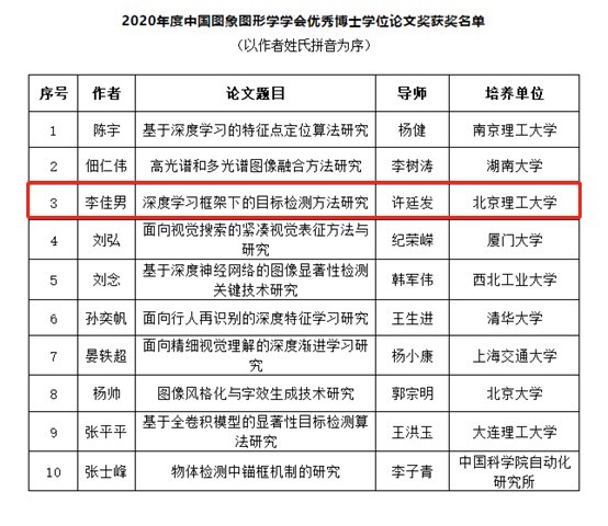 北理工博士生荣获“中国图象图形学学会优秀博士学位论文奖”